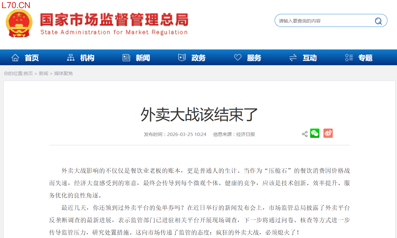 消息面上,市场监督管理总局转发经济日报文章《外卖大战该结束了》。文章称,外卖大战影响的不仅仅是餐饮业老板的账本,更是普通人的生计。当作为“压舱石”的餐饮消费因价格战而失速,经济大盘感受到的寒意,最终会传导到每个微观个体。健康的竞争,应该是技术创新、效率提升、服务优化的良性角逐。