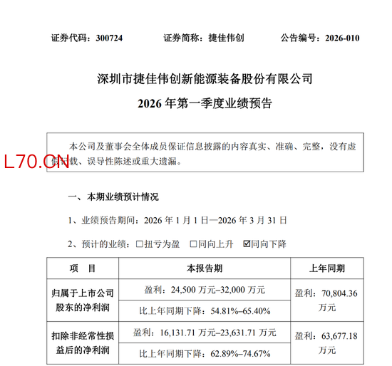 4月21日晚间,捷佳伟创发布2026年第一季度业绩预告。公告显示,报告期内,该公司实现归属于上市公司股东的净利润为2.45亿元至3.20亿元,较2025年同期下滑54.81%至65.40%。去年同期,捷佳伟创实现归属于上市公司股东的净利润为7.08亿元。