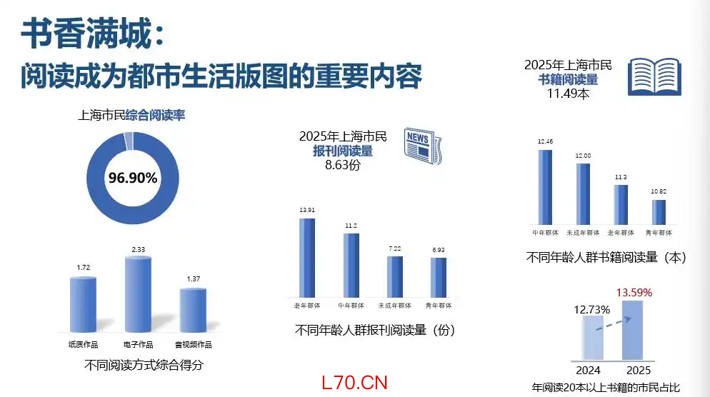年阅读20本书以上的读者属于“深阅读群体”,上海这个群体的读者正在扩大,2025年约占13.59%,高于2024年的12.73%。