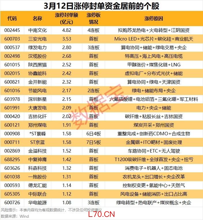 以封单金额计算,中南文化、三安光电、绿发电力等涨停板封单资金最多,分别有4.82亿元、3.53亿元、2.80亿元。