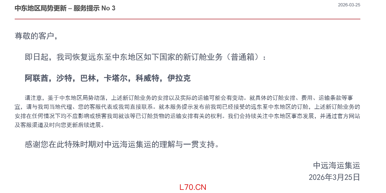 中远海运集运:即日起恢复至阿联酋,沙特,巴林,卡塔尔,科威特,伊拉克的新订舱业务中远海运集运:即日起恢复至阿联酋,沙特,巴林,卡塔尔,科威特,伊拉克的新订舱业务