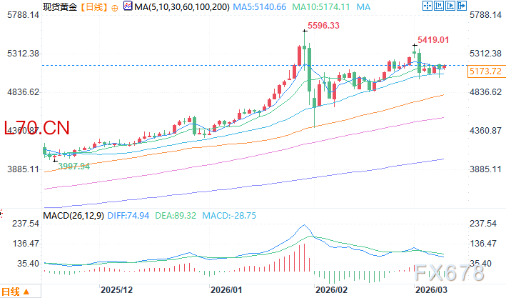 现货黄金日线图 来源:易汇通北京时间3月10日14:39 现货黄金 报 5176.72美元/盎司