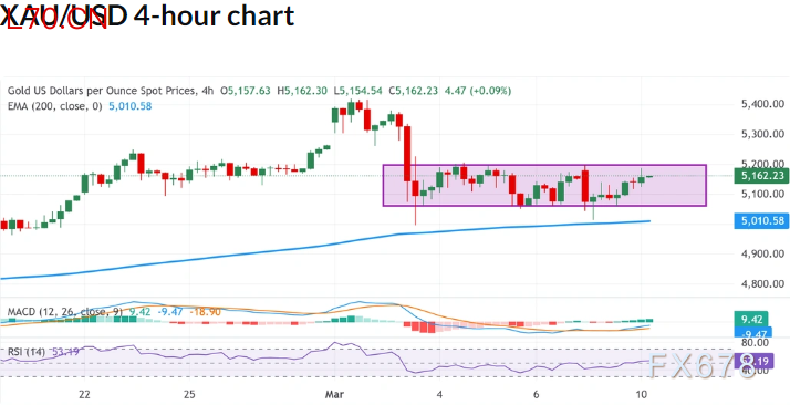 从技术面来看,金价过去一周左右一直在区间内震荡,并在4小时图上行走的200周期指数移动均线(EMA)附近获得支撑。该均线位于约5010美元附近,与交易区间的下端重合,应成为短期交易者的关键枢纽点。