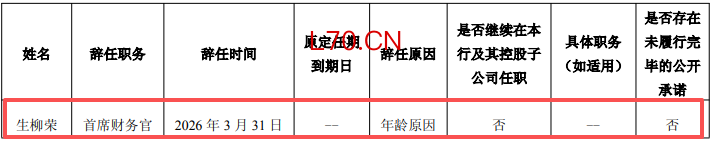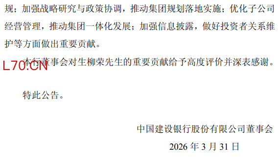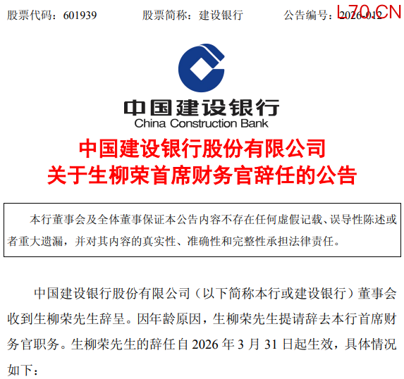 2026年4月1日,上交所主板上市公司建设银行(601939.SH)发布了《关于生柳荣首席财务官辞任的公告》。公告显示,因年龄原因,生柳荣先生提请辞去该行首席财务官职务。生柳荣先生的辞任自2026年3月31日起生效。