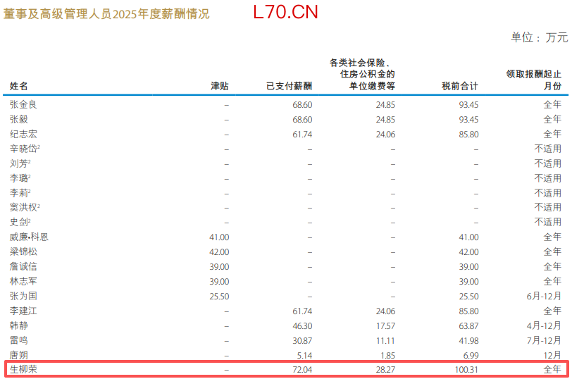 根据该公司2025年年报披露,生柳荣先生2025年度从公司获得的税前报酬总额为100.31万元。